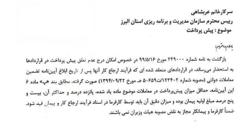 نامه سازمان برنامه استان البرز با موضوع “حداقل و حداکثر میزان پیش پرداخت در معاملات”