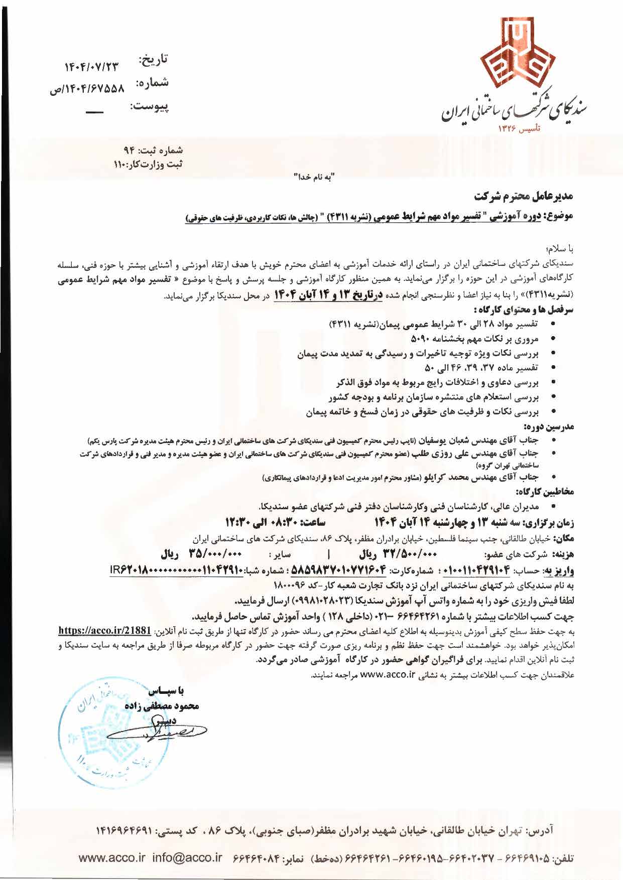 موضوع: دوره آموزشی ” تفسیر مواد مهم شرایط عمومی (نشریه ۴۳۱۱) ” (چالش ها، نکات کاربردی، ظرفیت های حقوقی)