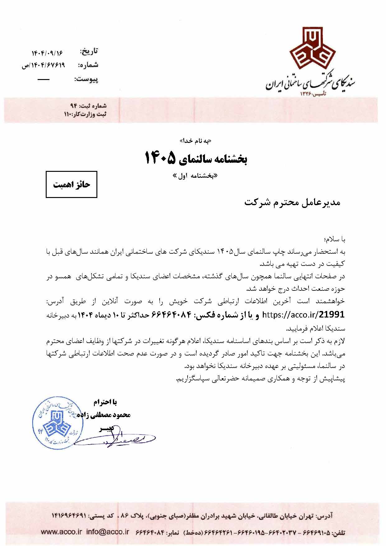 به استحضار میرساند چاپ سالنمای سال ۱۴۰۵ سندیکای شرکت های ساختمانی ایران همانند سالهای قبل با کیفیت در دست تهیه می باشد.