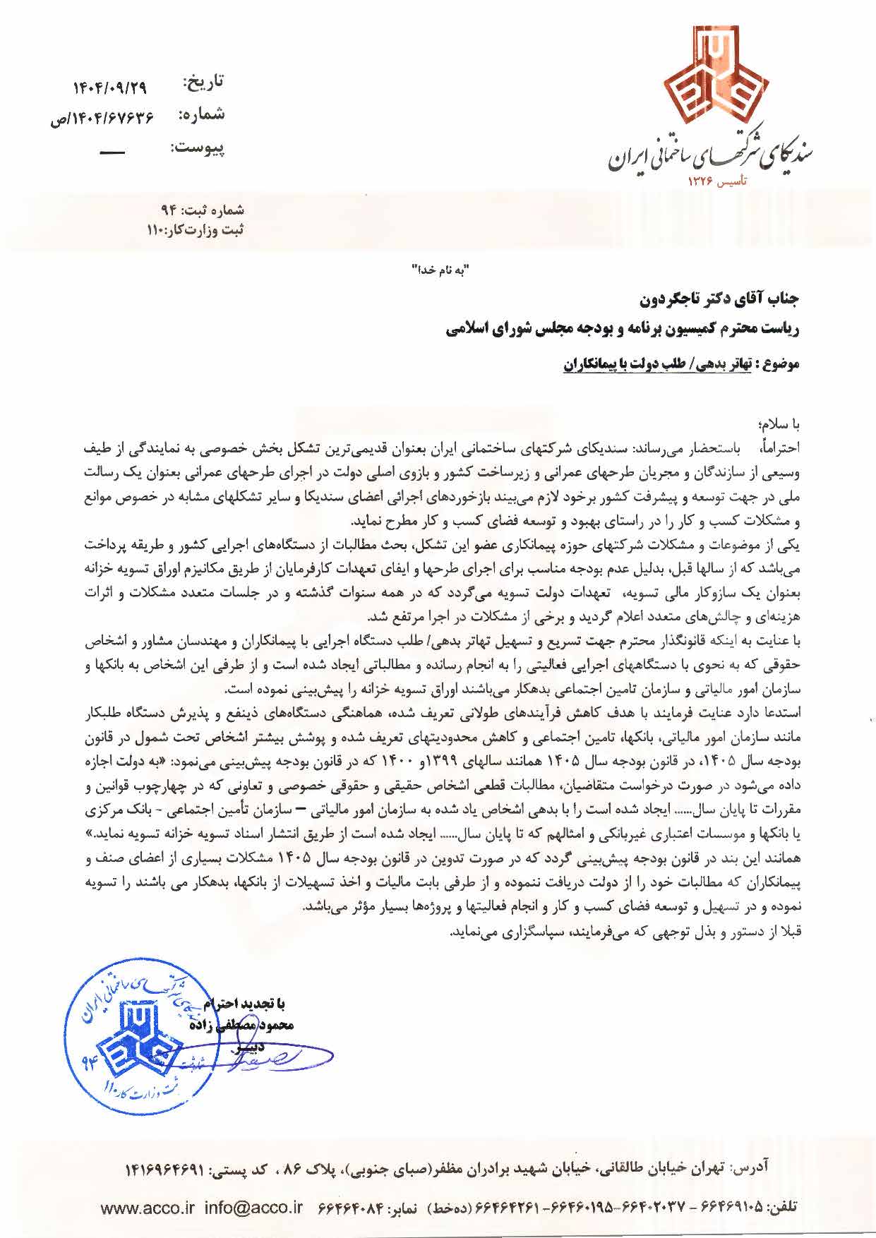 استدعا دارد عنایت فرمایند با هدف کاهش فرآیندهای طولانی تعریف شده، هماهنگی دستگاههای ذینفع و پذیرش دستگاه طلبکار مانند سازمان امور مالیاتی، بانکها، تامین اجتماعی و کاهش محدودیتهای تعریف شده و پوشش بیشتر اشخاص تحت شمول در قانون بودجه سال ۱۴۰۵، در قانون بودجه سال ۱۴۰۵ همانند سالهای ۱۳۹۹و ۱۴۰۰ که در قانون بودجه پیشبینی مینمود: «به دولت اجازه داده میشود در صورت درخواست متقاضیان، مطالبات قطعی اشخاص حقیقی و حقوقی خصوصی و تعاونی که در چهارچوب قوانین و مقررات تا پایان سال…… ایجاد شده است را با بدهی اشخاص یاد شده به سازمان امور مالیاتی – سازمان تأمین اجتماعی – بانک مرکزی یا بانکها و موسسات اعتباری غیربانکی و امثالهم که تا پایان سال…… ایجاد شده است از طریق انتشار اسناد تسویه خزانه تسویه نماید.»