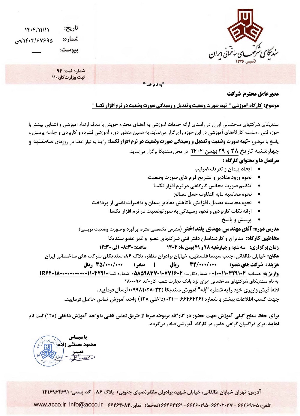 سندیکای شرکتهای ساختمانی ایران در راستای ارائه خدمات آموزشی به اعضای محترم خویش با هدف ارتقاء آموزشی و آشنایی بیشتر با حوزه فنی ، سلسله کارگاههای آموزشی در این حوزه را برگزار مینماید. به همین منظور دوره آموزشی فشرده و کاربردی و جلسه پرسش و پاسخ با موضوع «تهیه صورت وضعیت و تعدیل و رسیدگی صورت وضعیت در نرم افزار تکسا» را بنا به نیاز اعضا در روزهای سه شنبه و چهارشنبه تاریخ ۲۸ و ۲۹ بهمن ۱۴۰۴ در محل سندیکا برگزار مینماید.