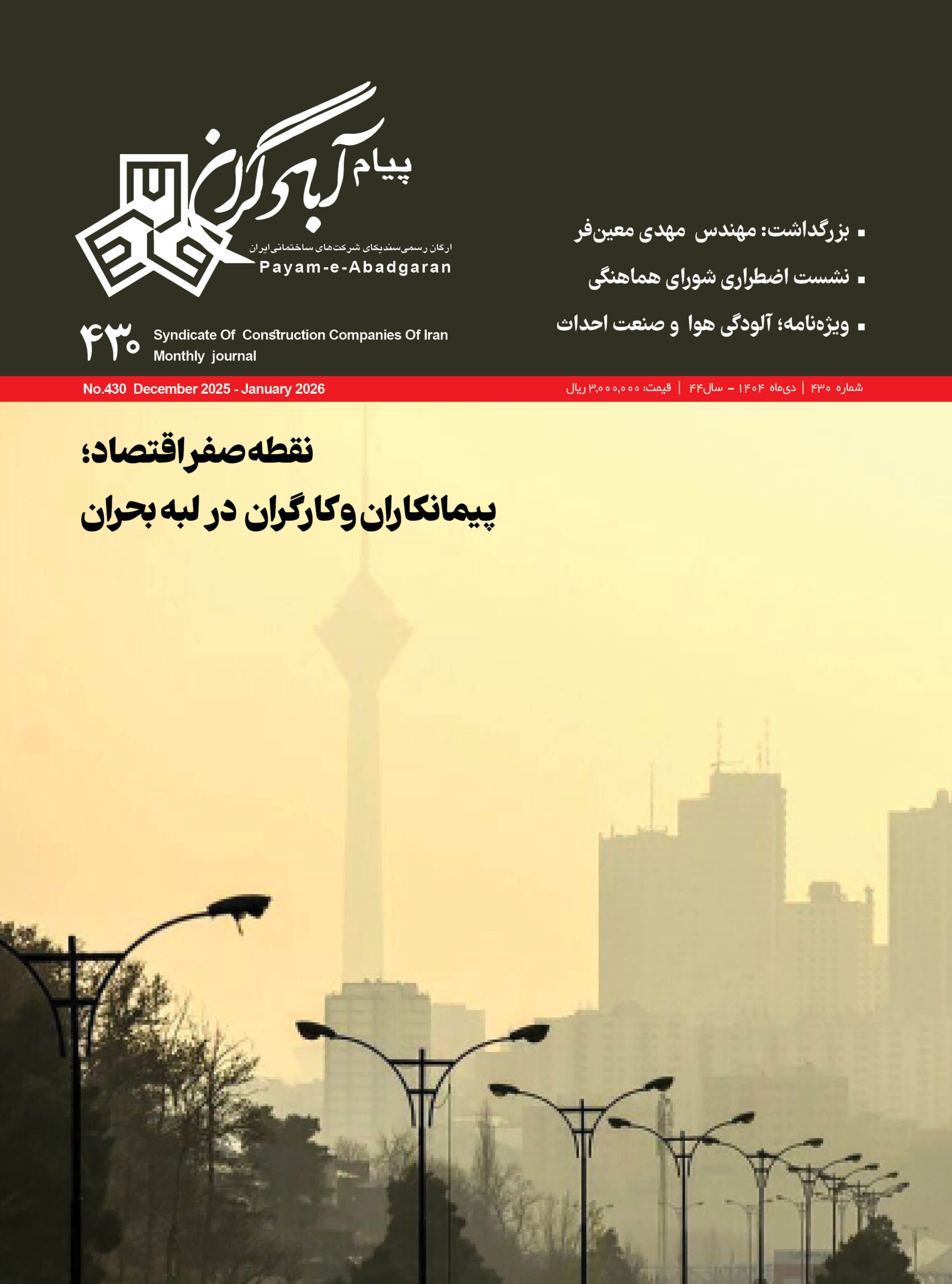ماهنامه پیام آبادگران شماره ۴۳۰، ارگان رسمی سندیکای شرکتهای ساختمانی ایران می باشد. شماره ۴۳۰ ویژه دی ماه ۱۴۰۴ منتشر گردید.