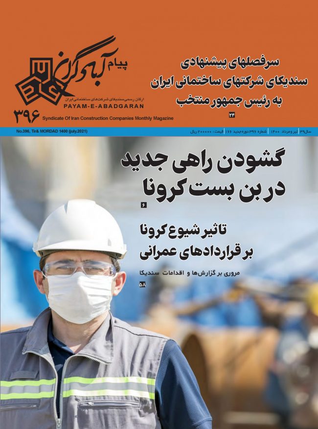 ماهنامه پیام آبادگران شماره ۳۹۶، ارگان رسمی سندیکای شرکت های ساختمانی ایران می باشد. شماره ۳۹۶ ویژه تیر و مرداد ۱۴۰۰ منتشر گردید.