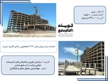 ۷- اجرای اسکلت بتنی بیمارستان ۳۱۳ تختخوابی خاتم الانبیا شیراز و احداث اسکلت های ساختمان های جنبی