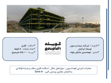 ۷- عملیات اجرایی فونداسیون ، دیوارهای حائل ، اسکلت فلزی سقف و عرشه فولادی ساختمان تجاری پردیس البرز