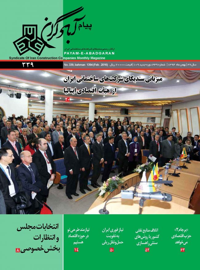 ماهنامه پیام آبادگران شماره ۳۳۹، ارگان رسمی سندیکای شرکت های ساختمانی ایران می باشد. شماره ۳۳۹ ویژه بهمن ۱۳۹۴ منتشر گردید.